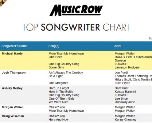HARDY, Thompson, Gorley: MusicRow Top Songwriter Chart’s Top Three